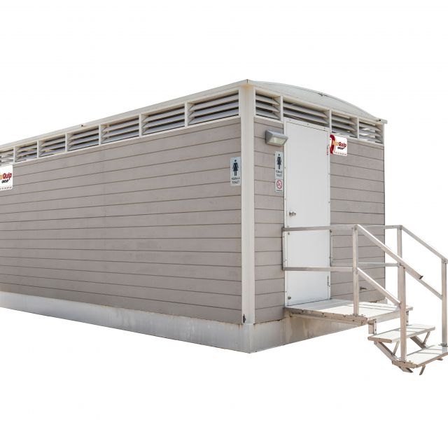 Our five star ablution building can be tailored to your individual needs. The middle door can be locked to separate male and female patrons. The top section features louvers for increased airflow and to allow natural light. All the tap ware on the vanities are controlled with electronic swipe pad...